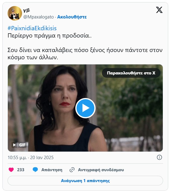 Πρεμιέρα έκανε τη Δευτέρα 21/1 στις 21:00 το νέο ερωτικό δράμα του ANT1 «Παιχνίδια εκδίκησης» και μέσα σε δύο ημέρες προβολής έχει καταφέρει να γίνει σοβαρό trend στο X.